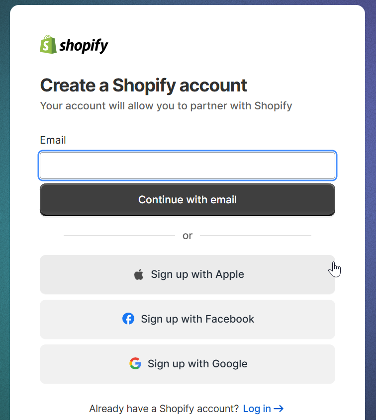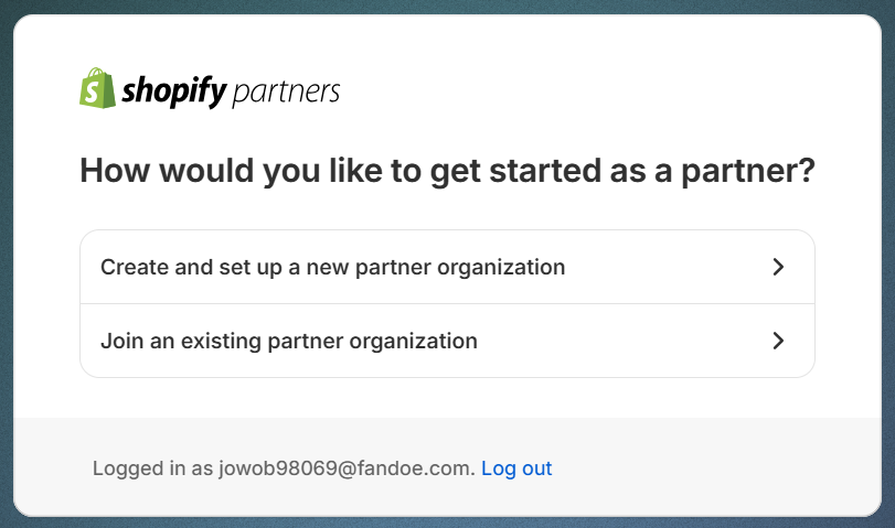 • Become a Shopify partner by registering, filling out all the required info, verifying your email, and testing the dashboard.