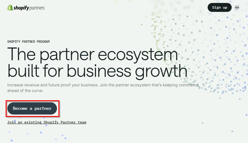 First, search for the Shopify Partners webpage. There, you will immediately find the option to ‘Become a Partner’.
